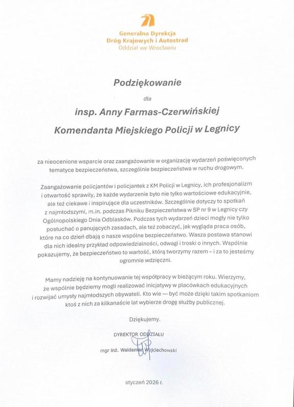 Do Komendy Miejskiej Policji w Legnicy wpłynęły podziękowania za zaangażowanie i wsparcie policjantów oraz policjantek w działania edukacyjne na rzecz bezpieczeństwa, ze szczególnym uwzględnieniem bezpieczeństwa w ruchu drogowym. To dla nas ogromna satysfakcja i potwierdzenie, że wspólne inicjatywy zwłaszcza te skierowane do najmłodszych mają realne znaczenie. Dziękujemy za docenienie naszej służby i zaufanie. Takie słowa motywują do dalszej pracy na rzecz bezpieczeństwa mieszkańców.