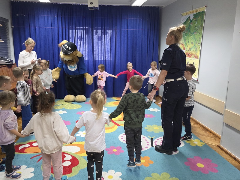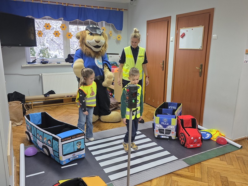 Największą atrakcją spotkania był Komisarz Lew – maskotka legnickiej Policji. Lew tego dnia był wyjątkową gapą i zapomniał, jak prawidłowo przechodzić przez drogę. Maluszki musiały go tego nauczyć. Swoją serdecznością, pogodnym usposobieniem i pełnymi energii gestami rozbawiał najmłodszych, jednocześnie angażując ich do aktywnego udziału w zajęciach. Dzieci z entuzjazmem odpowiadały na pytania i chętnie prezentowały, jak należy zachowywać się na przejściu dla pieszych.
