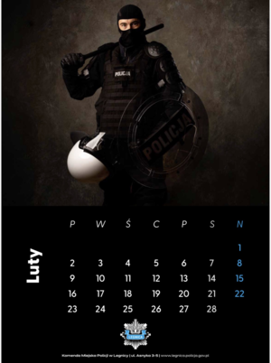 Kalendarz prezentuje funkcjonariuszy w różnych rodzajach umundurowania, ukazując różnorodność policyjnej służby, jej charakter oraz profesjonalizm. Projekt wyróżnia się spójną, wyrazistą stylistyką, nadającą kalendarzowi elegancki i zdecydowany charakter.