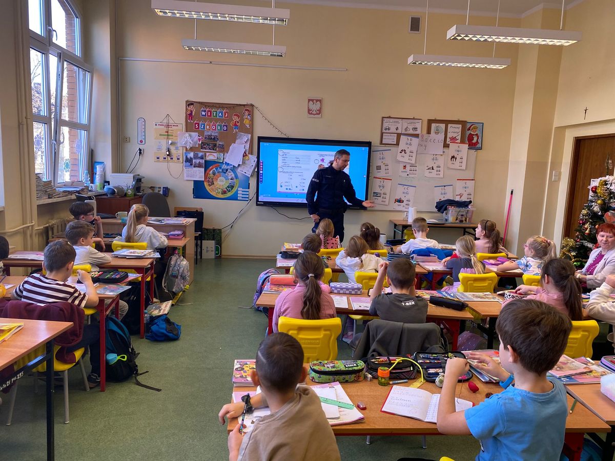 Dzielnicowi z Komisariatu Policji w Chojnowie odwiedzili uczniów Szkoły Podstawowej nr 3 w Chojnowie, aby porozmawiać z nimi o zasadach bezpieczeństwa w związku ze zbliżającymi się feriami zimowymi.