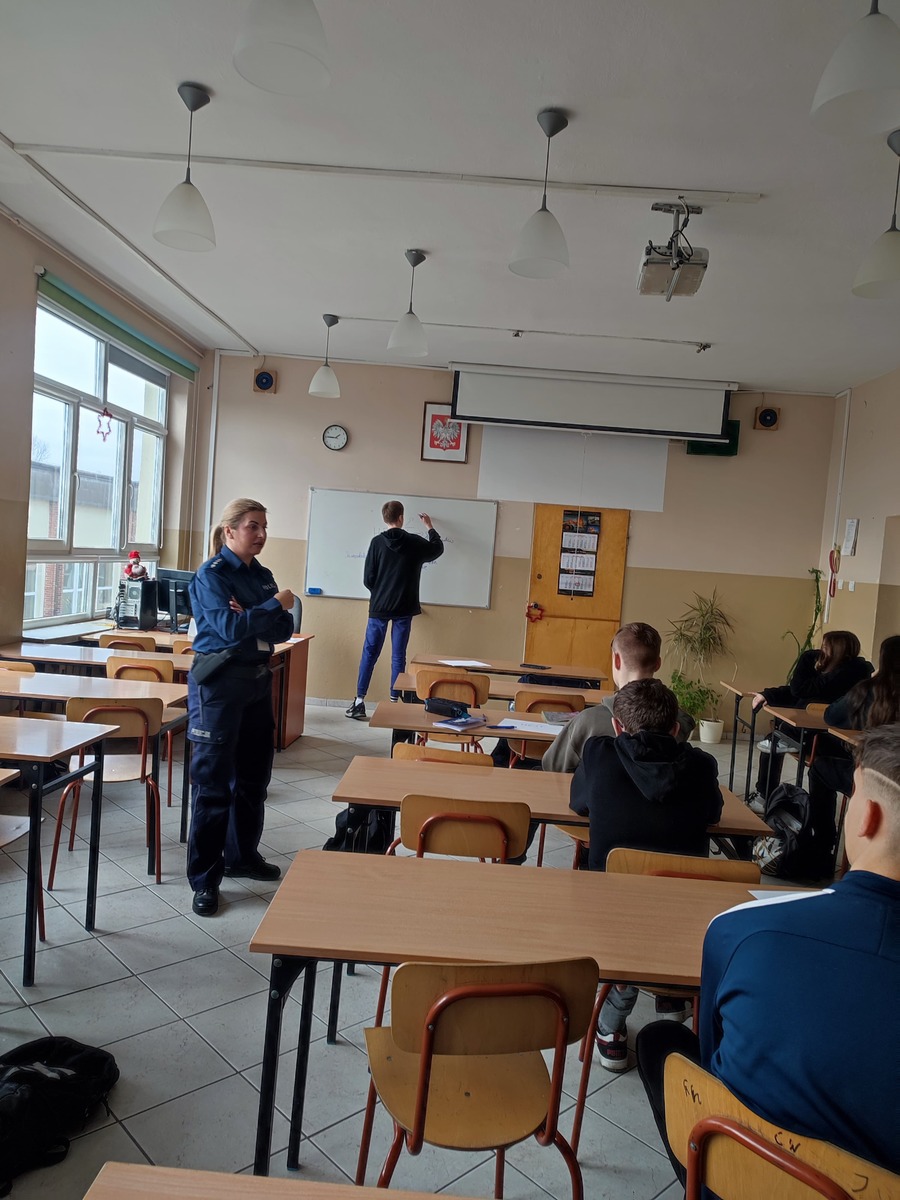 W ramach działań profilaktycznych policjantka z Wydziału do spraw Nieletnich i Patologii Komendy Miejskiej Policji w Legnicy odwiedziła uczniów Zespołu Szkół Technicznych i Ogólnokształcących w Legnicy. Spotkanie poświęcone było bezpieczeństwu podczas zbliżających się ferii zimowych, a także problematyce hejtu i przemocy rówieśniczej.