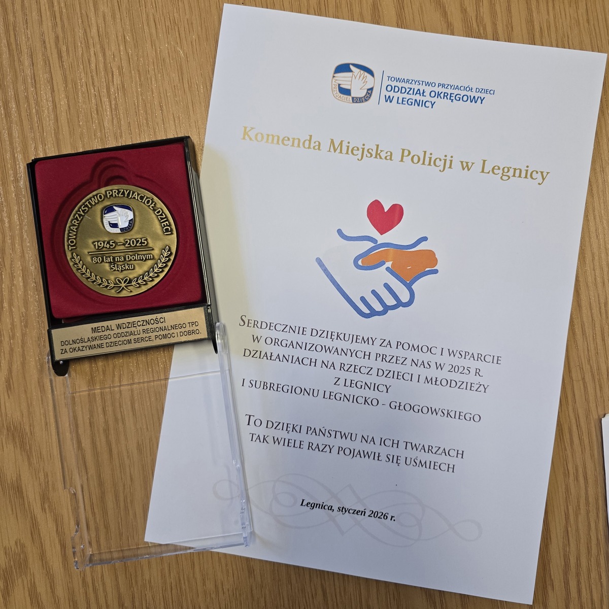 Towarzystwo Przyjaciół Dzieci przekazało podziękowanie oraz Medal Wdzięczności w uznaniu za pomoc i wsparcie okazane podczas działań realizowanych w 2025 roku na rzecz dzieci i młodzieży z Legnicy oraz subregionu legnicko-głogowskiego.