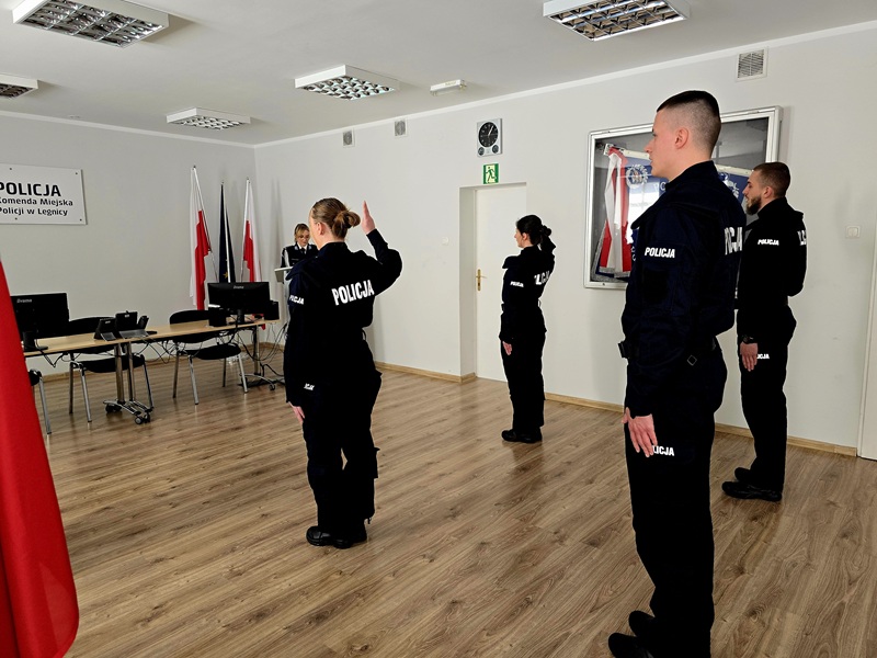 „Ja, obywatel Rzeczypospolitej Polskiej, świadom podejmowanych obowiązków policjanta, ślubuję: służyć wiernie Narodowi, chronić ustanowiony Konstytucją Rzeczypospolitej Polskiej porządek prawny, strzec bezpieczeństwa Państwa i jego obywateli, nawet z narażeniem życia. Wykonując powierzone mi zadania, ślubuję pilnie przestrzegać prawa, dochować wierności konstytucyjnym organom Rzeczypospolitej Polskiej, przestrzegać dyscypliny służbowej oraz wykonywać rozkazy i polecenia przełożonych. Ślubuję strzec tajemnic związanych ze służbą, honoru, godności i dobrego imienia służby oraz przestrzegać zasad etyki zawodowej" – dzisiaj te słowa roty ślubowania wypowiedziało czterech nowych funkcjonariuszy Komendy Miejskiej Policji w Legnicy.