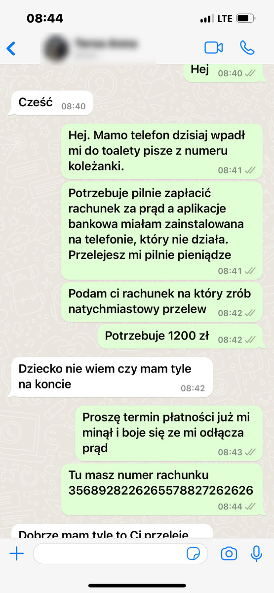 Hej mamo, tato lub babciu, telefon wpadł mi do ubikacji. Po tej wiadomości pojawia się kolejna z prośbą o przelanie pieniędzy. Apelujemy o ostrożność i przypominamy o ograniczonym zaufaniu podczas takich kontaktów.
